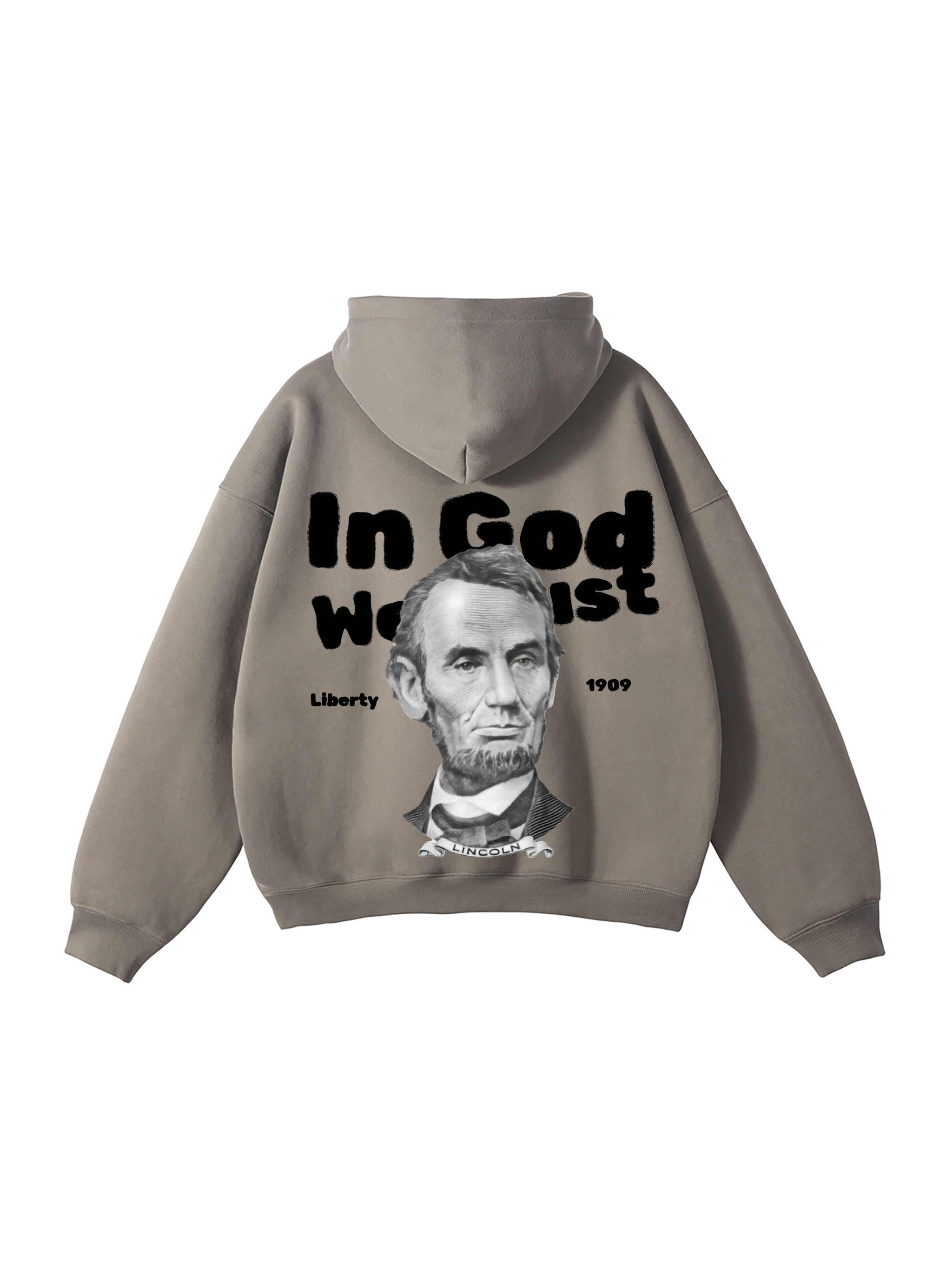 Each hoodie is individually spray painted by hand, making every piece one-of-a-kind. Featuring the bold phrase “In God We Trust” and a stamped graphic of Lincoln’s face, this oversized fleece hoodie blends faith and street culture with raw, unapologetic energy. A penny detail on the front adds symbolic weight—honoring value beyond currency. Designed for presence, built for comfort, and crafted to stand out in any crowd.